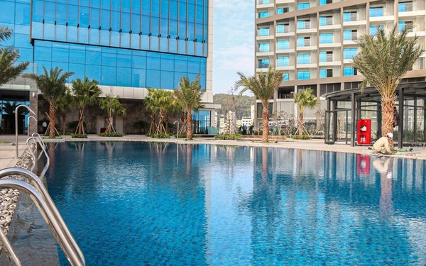 Khu vực bể bơi tại Mường Thanh Hạ Long Centre được ví như một “ốc đảo xanh” giúp du khách có thể hòa mình cùng thiên nhiên và tận hưởng làn nước trong xanh hay vui chơi, thư giãn bên cả gia đình ấn tượng.